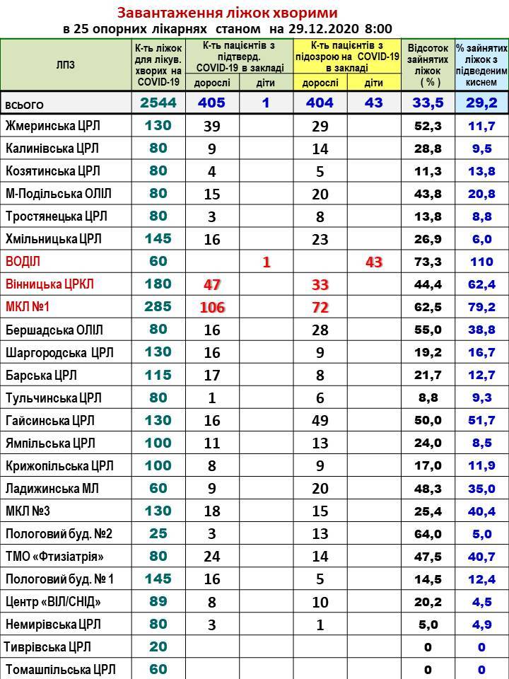 За інформацією Департаменту охорони здоров’я та реабілітації Вінницької ОДА, у 25 опорних лікарнях області, станом на ранок 29 грудня на стаціонарі із підтвердженим COVID-19 перебуває 405 дорослих та 1 дитина. Окрім того, з підозрою на коронавірус госпіталізовано 404 дорослих та 43 дитини.