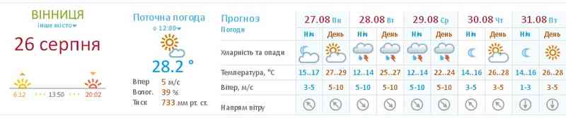 Як зазначають у Укргідрометеоцентрі, 27 серпня у Вінницькій області ще зберігатиметься звична спека з температурою до +30 градусів, а з наступного дня «почнеться» осінь. Вітер північно-західного напрямку принесе в область зливи. Синоптики наголошують, що можливі грози та град. Температура понизиться до 22-24 градусів.