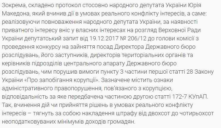 Національне агентство з питань запобігання корупції направило до суду адмінпротокол стосовно депутата від БПП Юрій Македона стосовно недотримання ним законодавства щодо запобігання та врегулювання конфлікту інтересів. Парламентар з Вінниччини у Facebook зазначив, що претензії стосуються його запитів до ДБР, яке очолює Р. Труба, а він сам колись був кандидатом на цю посаду.