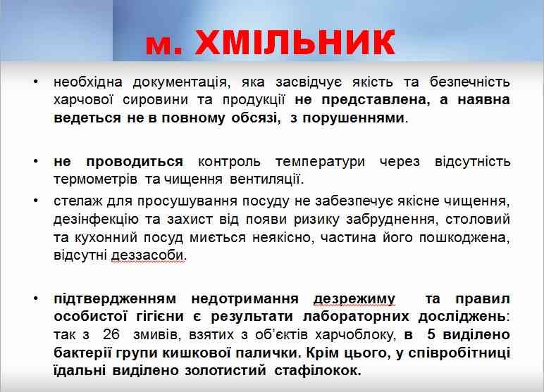 «На минулому тижні ускладнення епідситуації реєструвалось і в школі - гімназії №1 м. Хмільник, де 11 вересня до навчання у початковій школі не приступило 33 дітей. Фахівцями ГУ Держпродспоживслужби проведено позапланове інспектування харчоблоку зазначеного навчального закладу. І якщо матеріально-технічна база тут досить непогана, то людська безвідповідальність аж зашкалює: необхідна документація, яка засвідчує якість та безпечність харчової сировини та продукції не представлена, а наявна ведеться не в повному обсязі та з порушеннями. Не дотримується дезрежим та правила особистої гігієни. Виявлено бактерії групи кишкової палички. Крім того, у співробітниці їдальні виділено золотистий стафілокок», - підкреслив І. Івасюк.