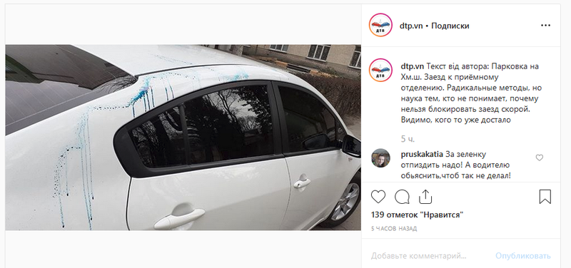 Фото облитого зеленкою автомобіля опублікували сьогодні у вінницькій спільноті Dtp.vn в Instagram. Судячи з коментарів під дописом, таким «оригінальним» чином хтось з вінничан намагався «донести» до водія, що не можна паркуватися на в’їзді до прийомного відділення лікарні.