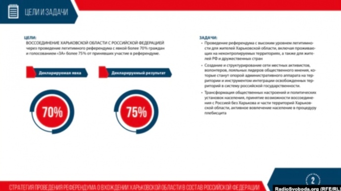 «Радіо Свобода «Донбас Реалії» з посиланням на документ, отриманий від джерел в одному з розвідувальних органів України, вказує, що на Харківщині Росія планувала провести так званий «референдум» з 1 по 7 листопада. Заздалегідь було визначено, що 75% мали «проголосувати» схвально.