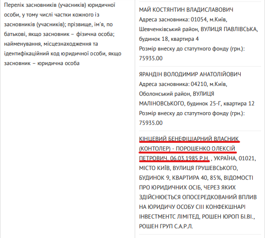 Аналітики ЦПК виявили, що за станом на 6 листопада бенефіціаром компанії вже вказаний Порошенко Олексій Петрович - старший син парламентаря. Це підтверджує Єдиний державний реєстр юридичних осіб, фізичних осіб-підприємців та громадських формувань (ЄДР).