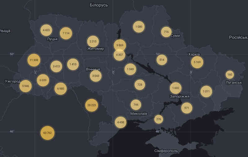 Найбільше нових випадків коронавірусу зафіксовано у Києві (182), Львівській (166), Харківській (139), Івано-Франківській (128), Чернівецькій (113), Рівненській (96), Одеській (94) і Закарпатській (71) областях.