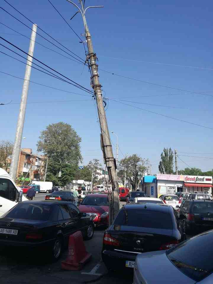 Вінничанка Марія Корпанюк виклала у Facebook світлину, на якій видно, що електропора нахилена і от-от може впасти. Містяни через соцмережу почали шукати представників тих служб, які готові врятувати автівки, що припаркувалися біля стовпа у районі ринку «Урожай».