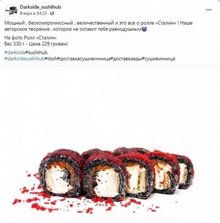 У неабиякий скандал "вляпався" вінницький ресторан Darkside Sushi Hub. Там створили авторський рол і назвали його "Сталін". Чому саме так, ресторатори досі не пояснили, хоча після хвилі обурення у соцмережах перейменували страву і навіть вибачилися перед тими, кого образили.