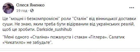 "Не знаю, яким треба бути відірваним від українських реалій, щоб це зробити. "Мені одного «Сталіна» пожалуста і стакан «Гітлера». Салатик «Чикатило» не забудьте", - пише у мережі журналістка Олеся Яненко.