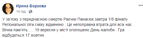 Сьогодні, 18 жовтня, у Вінниці мала відбутися 1/8 фіналу Регіональної ліги сміху. Однак гумористичну гру перенесли у зв’язку з Днем жалоби, який у місті оголосили сьогодні у зв’язку із прощанням з Раїсою Панасюк. Про це на своїй сторінці у Facebook повідомила організатор фестивалю Ірина Борзова.