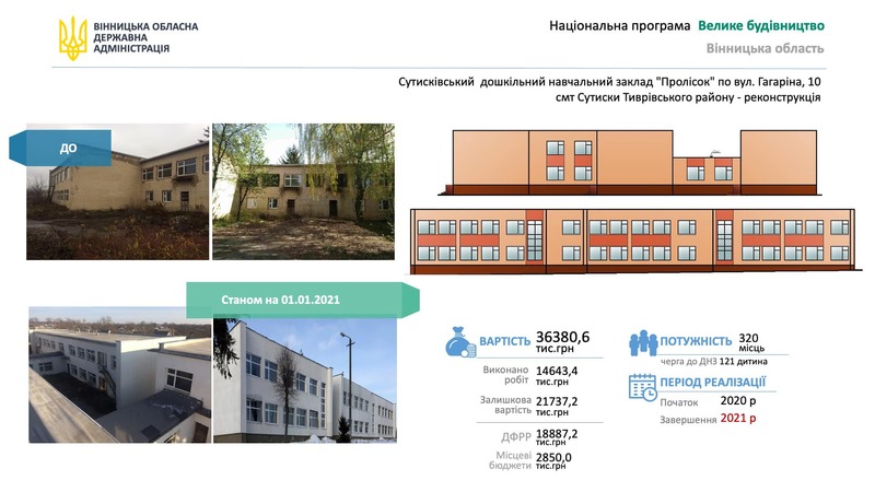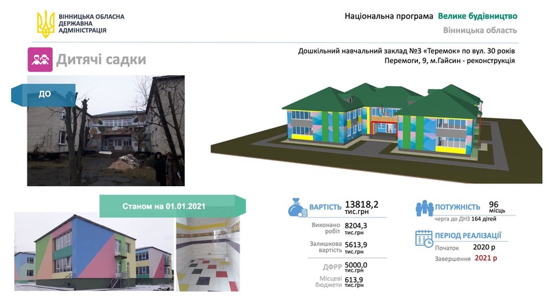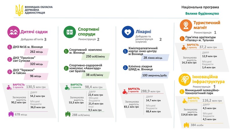 Передбачається добудувати три дитсадки (у Вінниці - ДНЗ№16, садочок "Пролісок" у Сутисках та ДНЗ "Теремок" у Гайсині), реконструювати дві спортивні споруди (спорткомплекси у Вінниці та Браїлові), добудувати та реконструювати дві лікарні (хіміотерапевтичний корпус онкоцентру та клінічну лікарню швидкої допомоги у Вінниці), один туристичний об'єкт (палац Потоцьких у Тульчині) та один об'єкт інноваційної інфраструктури (Вінницький інноваційно-технологічний парк).
