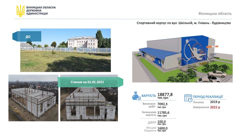 Заплановано також реконструкцію корпусу №7 обласної лікарні імені Пирогова, де буде розміщуватись нейрохірургічне відділення з рентгенопераційним блоком та відділення гострих інсультів. Передбачено виділення коштів на реконструкцію концертної зали будівлі на Театральній, 15, у Вінниці, спального корпусу Хмільницької обласної фізіотерапевтичної лікарні та будівництво спортивного комплексу у Гнівані.