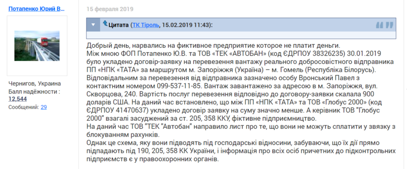 Перевізники також оприлюднили листування з екс-власником, який написав, що фірма «ТЕК “Автобан» не веде діяльності з 2013 року, а її печатка, якою користуються шахраї, є підробкою, тому порекомендував писати заяву в поліцію.