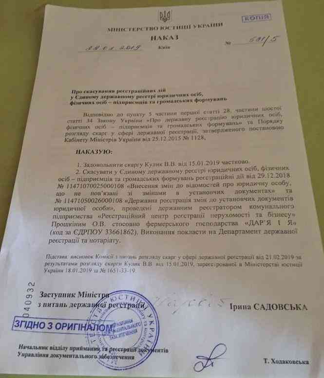 «Увечері 31 грудня 2018-го зателефонували і єхидно повідомили, що нас чекає сюрприз. Щоб дізнатися який саме, треба заглянути у Держреєстр. У нас мову відняло, коли побачили, що власником нашого фермерського господарства значиться інша людина, жінка з Києва. Знайшовся реєстратор, який у Держреєстрі змінив наше прізвище. Господарство переписали на людину, якої слідчі так і не знайшли, нема такої. За вказаною київською адресою знаходиться торговельний центр», — повідомила жінка.