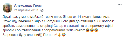 Але Гром вирішив продовжити свій тату-челендж. Тепер із аналогічною пропозицією він звернувся до прихильників Петра Порошенка. Навіть показав ескіз тату, яке нанесе собі або ж, за бажанням, тому, хто зробить найбільше замовлення. Термін однаковий - п'ять днів - до 1 липня.
