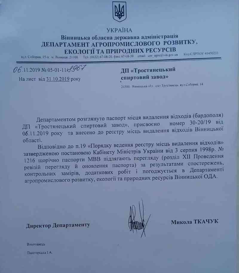 Зазначимо, що до жовтня влада використовувала як інструмент тиск на завод непогодженням паспорту на місця викидів. Проте за запит від 31 жовтня вже 6 листопада за підписом директора департаменту АПК М. Ткачук цей документ було видано на ФОП Гончарук В.С. А погодили його у Держпродспоживслужбі.