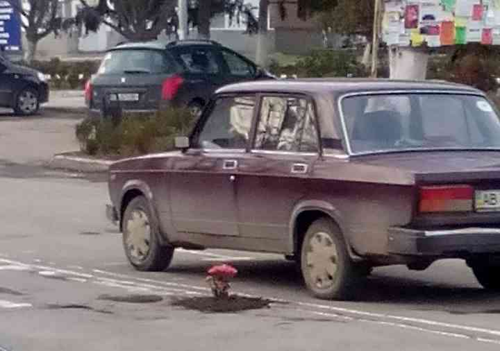 У Ладижині задля того, щоб привернути увагу чиновників до стану доріг, активісти почали "латати" ями самотужки – висаджуючи у них квіти. Перша "клумба" у місті з'явилася у суботу, 31 березня.