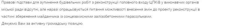 Оскільки петиція зібрала 368 підписів, то у мерії її розглянули та відповіли підписантам. Зупиняти реконструкцію підстав немає. З проектом, який було затверджено, можна «індивідуально» ознайомитися у департаменті капітального будівництва, а щодо змін у архітектурний ансамбль, то питання ще залишається відкритим. Також відповіли наступне: