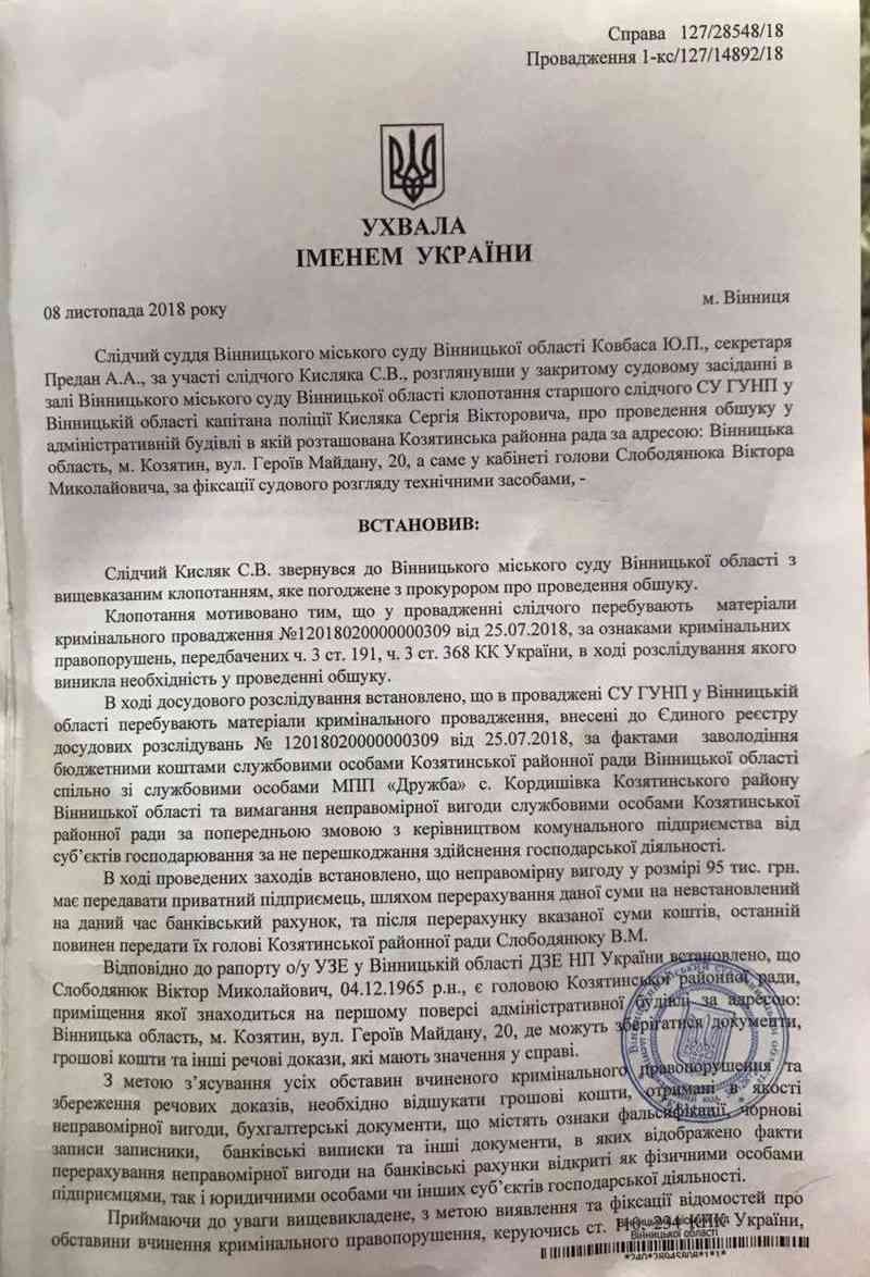 Також зазначимо, що NaПарижі отримав копію ухвали Вінницького міськсуду від 8 листопада про обшук у адмінприміщенні Козятинської райради, який розкриває інші деталі справи.