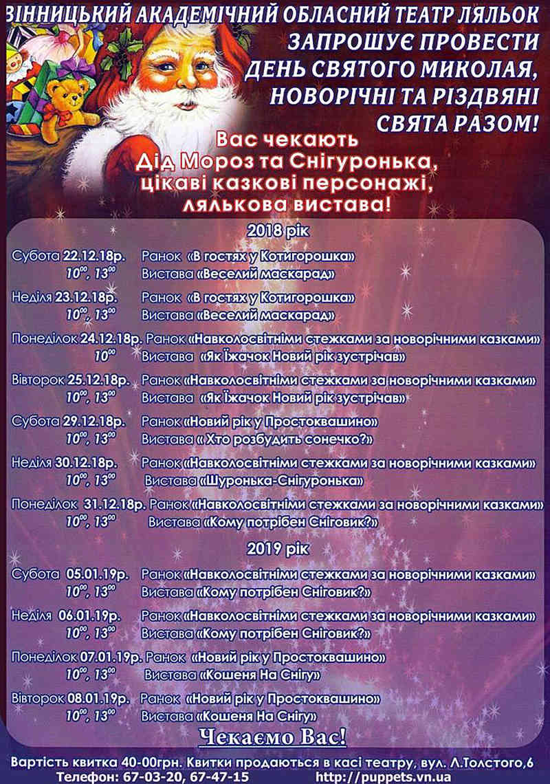 У новорічні й різдвяні святкові дні у Вінницькому академічному обласному театрі ляльок маленьких вінничан традиційно чекають цікаві тематичні вистави. Їх із задоволенням дивитимуться не лише діти, а й їх батьки.