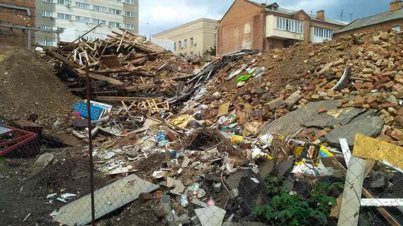 З кінця минулого року лише огорожа видає будівельний майданчик на місці колишнього готелю «Центральний», що по вул. Соборній, 29, у центрі Вінниці. За ним утворився доволі великій смітник, де будівельні відходи «поєднуються» зі звичайними побутовими. Місцеві жителі розводять руками нібито не знають, хто кидає сміття через рабицю.
