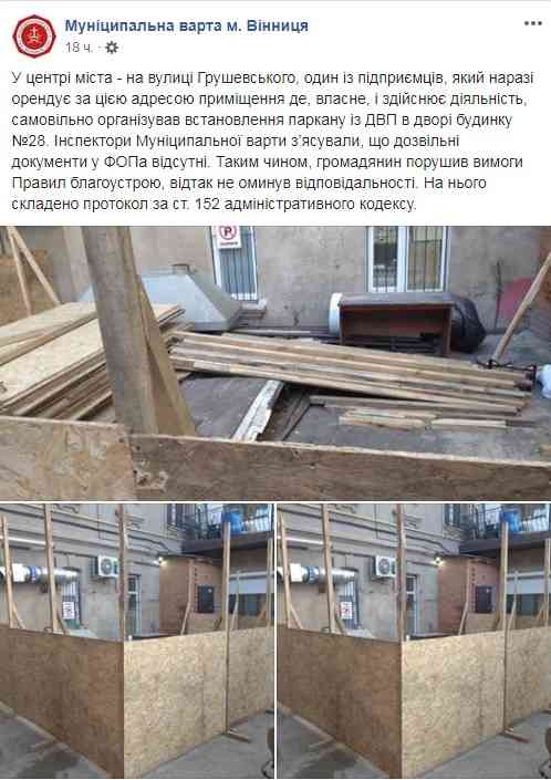 Як повідомили на сторінці у Facebook працівники Муніципальної варти Вінниці, порушник наразі орендує по вулиці Грушевського приміщення де, власне, і здійснює діяльність. Мабуть йому не вистачило площі, або він подумав, що територія біля приміщення також його, й самовільно організував встановлення паркану із ДВП в дворі будинку №28.