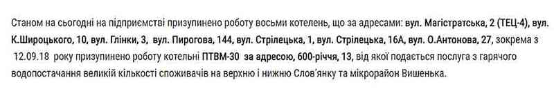 Чому це сталося? В оприлюдненому на сайті КП «Вінницяміськтеплоенерго» повідомленні не йдеться про якісь планово-ремонтні роботи чи аварії. Натомість вказуються адреси котелень, що припинили гріти воду, а також зазначається розмір заборгованості містян за надані цим підприємством послуги. Станом на початок вересня він складає 60 млн грн.