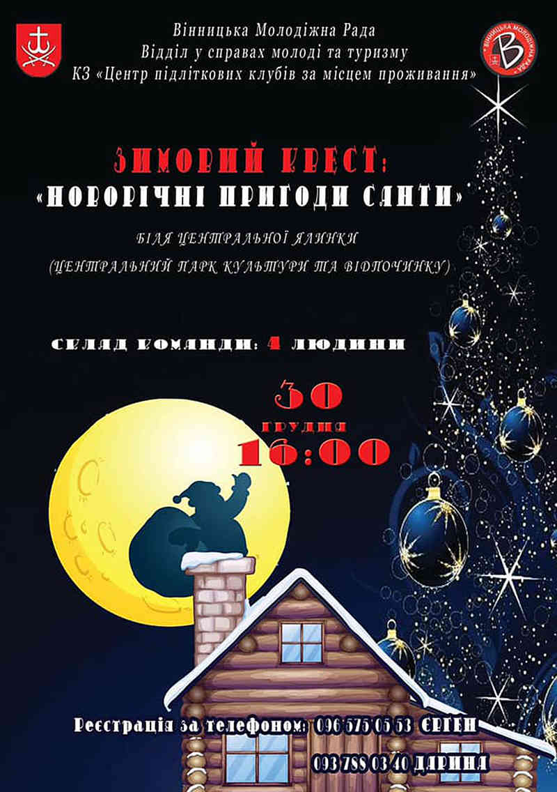 «Новорічні пригоди Санти» – це один з новорічних заходів, чимало яких нині проводиться у нашому місті. Влаштовують його для дітей. Відбудеться цей квест у неділю, 30 грудня, у Центральному парку біля головної ялинки Вінниці. Почнеться – о 16:00.