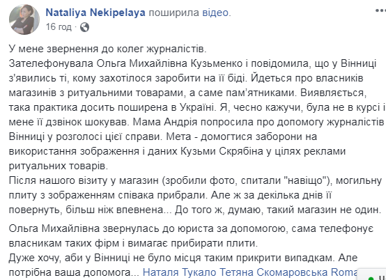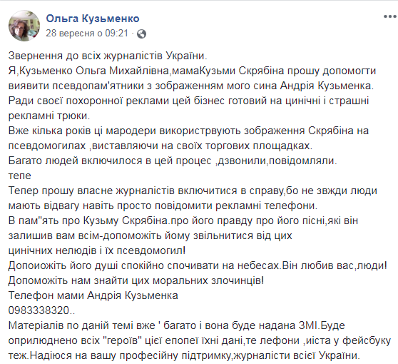 Ритуальні бюро та фірми з виготовлення пам'ятників по всій Україні використовують для реклами зображення покійного музиканта Кузьми Скрябіна. Про це на своїй сторінці у Facebook розповіла мама співака Ольга Кузьменко.