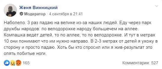 У Facebook-групі «Чорний список Вінниця» постійно з’являються нові дописи з проханнями від велосипедистів про звільнення спеціально відведеної дороги. Адже ні сигнали дpвінка, ні крики не допомагають їхати без перешкод, що часто призводить до травмування велосипедиста.