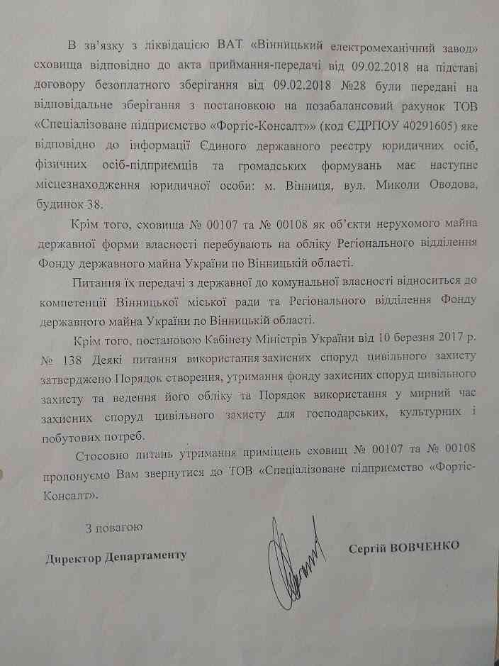 Проте директор департаменту цивільного захисту Вінницької облдержадміністрації Сергій Вовченко рекомендував мешканцям шукати «відповідального» утримувача «Фортіс-Консалт» стосовно питань утримання приміщення і на цьому функцію контролю за станом захисних споруд вважає виконаною.