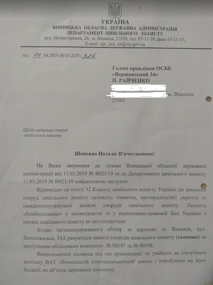 Нарешті, після року офіційної переписки та перемовин, ми отримали офіційну відповідь. Але! Власник даного приміщення фактично відмовляється від його утримання та пропонує нам звернутись до фірми, яка узяла його на зберігання. Що це? Халатне відношення чи спроба "загубити" бомбосховище для подальшої його передачі у приватні руки? ОСББ залишати дану ситуацію не будуть, то ж впевнені, що буде продовження».