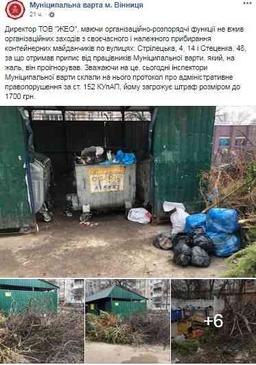 Як стало відомо зі сторінки у Facebook "Муніципальна варта Вінниці", директор ТОВ "ЖЕО" маючи усі організаційно-розпорядчі функції не вжив організаційних заходів зі своєчасного і належного прибирання контейнерних майданчиків по вулицях: Стрілецька, 4, 14 і Стеценка, 48, за що отримав припис від інспекторів. Однак виконати його чоловік "забув".