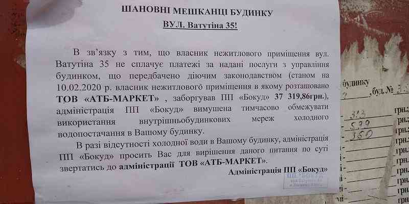 Як повідомляє VinMedia, мешканці будинку по вулиці Ватутіна, 35 були здивовані «листом щастя» від ПП «Бокуд» (приватний вінницький ЖЕК, якщо нормальною мовою). Виявилось, що магазин АТБ, який знаходиться у даному будинку, заборгував «Бокуду» за обслуговування більше 37 тисяч гривень. І що вирішив зробити ЖЕК? Судитися? Вимагати оплати? Ні, ПП «Бокуд» чомусь вирішив відімкнути мешканцям будинку холодну воду за борги магазину.