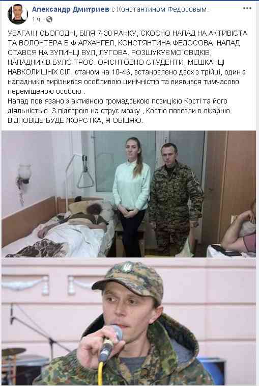 За словами О. Дмитрієва, напали на волонтера о 7.30 біля зупинки «вул. Лугова». Костю госпіталізовано до лікарні швидкої допомоги. Попередньо в нього діагностовано струс мозку.