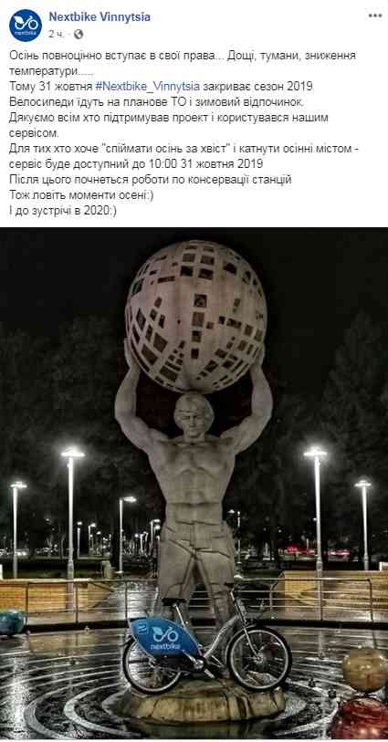 Як повідомили у мережі Facebook на офіційній сторінці Nextbike Vinnytsia представник компанії Nextbike у Вінниці Олександр Царевський, дане рішення було прийнято з огляду на довгостроковий прогноз погоди.