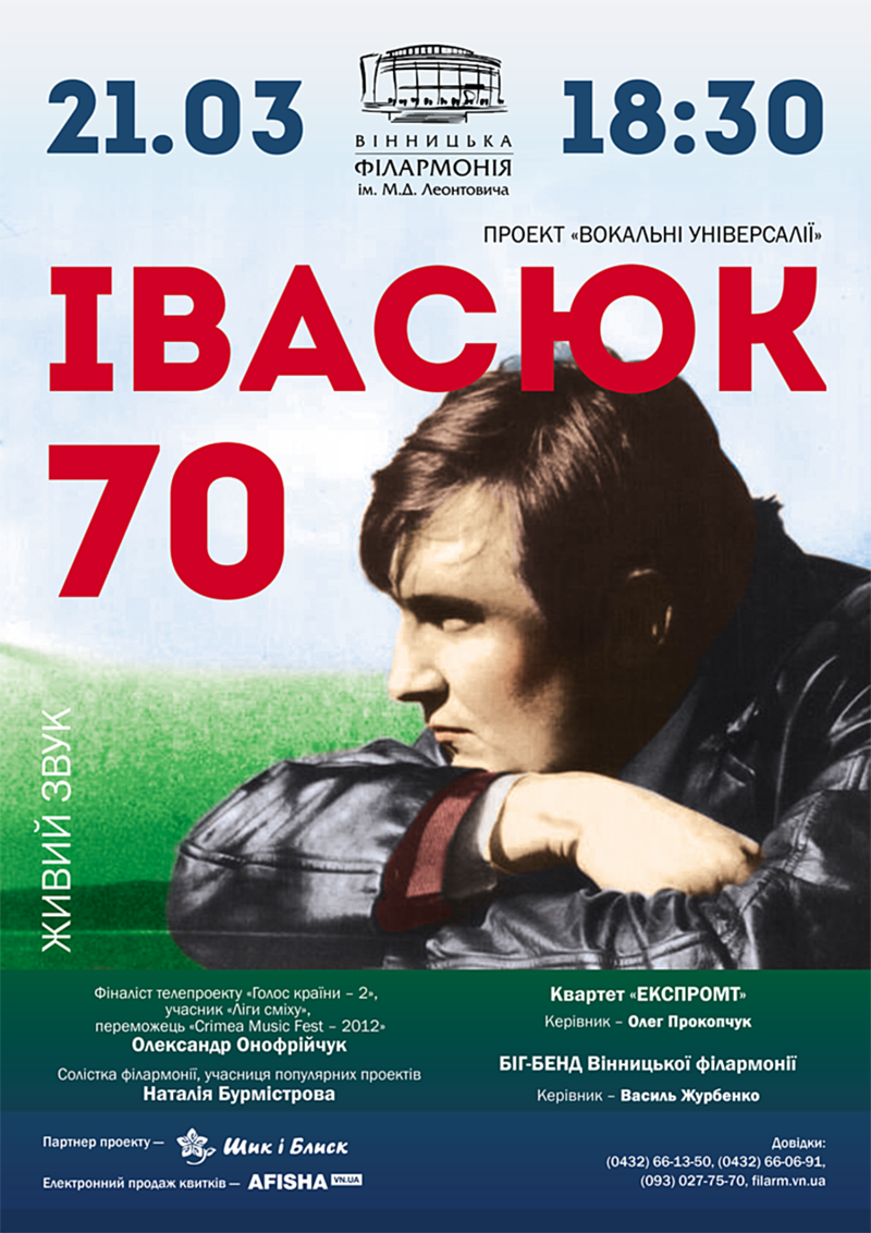 «Цієї весни свій 70-річний ювілей міг би відзначати один із основоположників української естрадної музики, «співець синіх гір» — Володимир Івасюк — автор пісні, яку називають одним із кращих творінь українців у світі — «Червона рута». Ми приєднуємось до всеукраїнського марафону мистецьких заходів, що триватимуть протягом року, і презентуємо проект «Івасюк-70». 21 березня на сцені філармонії у виконанні солістів Наталії Бурмістрової, Олександра Онофрійчука у супроводі Квартету «Експромт» (музичний керівник — Олег Прокопчук) та біг-бенду (диригент — Василь Журбенко) прозвучать найпопулярніші та рідко виконувані пісні Івасюка, постануть фрагменти інтерв’ю з молодим композитором та рідкісні архівні фото», – повідомили у прес-службі Вінницької обласної філармонії.