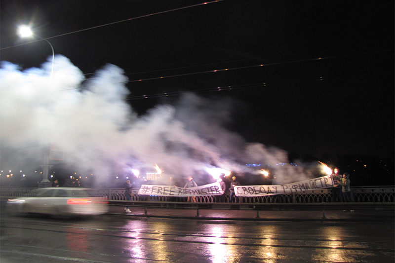 Відбулася акція у новому форматі. Банерами прикрасили тротуар Центрального мосту у годину найбільшого навантаження. Активісти використовували піротехніку з димом синього та жовтого кольорів, та не помилилися із підтримкою містян.