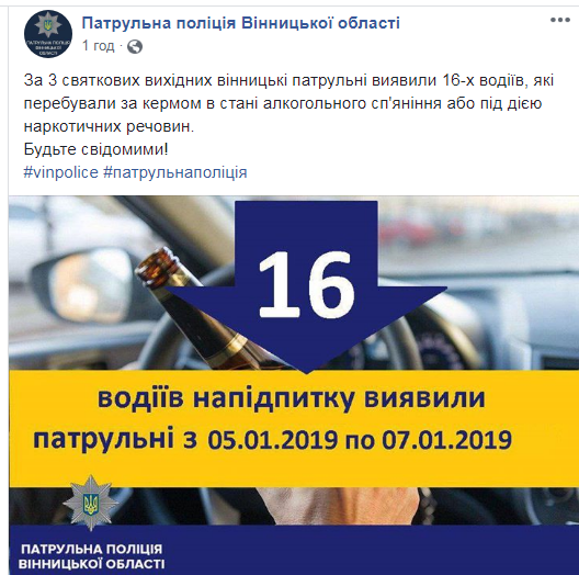 За три святкових вихідних, 5-7 січня, патрульні у Вінниці «впіймали» 16 водіїв, які були на підпитку, або під дією наркотичних речовин. Про це повідомила прес-служба Управління патрульної поліції області на сторінці у Facebook.