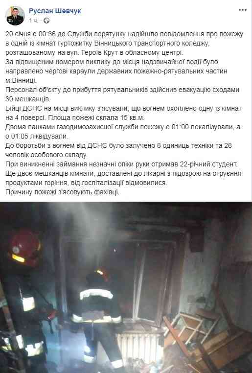 Вночі 20 січня стало відомо про пожежу у гуртожитку Вінницького транспортного коледжу. Вогнем було охоплено одну з кімнат будинку на вул. Героїв Крут, що на Замості. Опіки руки отримав 22-річний студент.