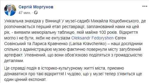 Мер Вінниці Сергій Моргунов у Facebook написав, що у місцевому літературно-меморіальному музеї Михайла Коцюбинського знайшли «меморіальну таблицю, якій майже 100 років». Саме стільки, як і вінницькому закладу…