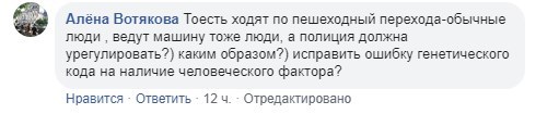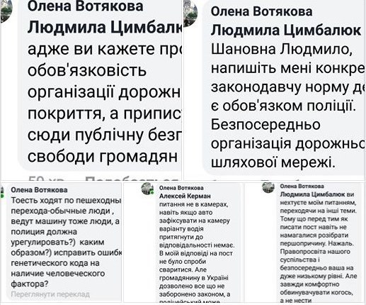 Значно пізніше під постом Л. Цимбалюк виникла доволі дивна дискусія. Офіцерка патрульної поліції Вінниччини Олена Вотякова у коментарі висловила свою думку, можливо, особисту, щодо ситуації на перехресті.