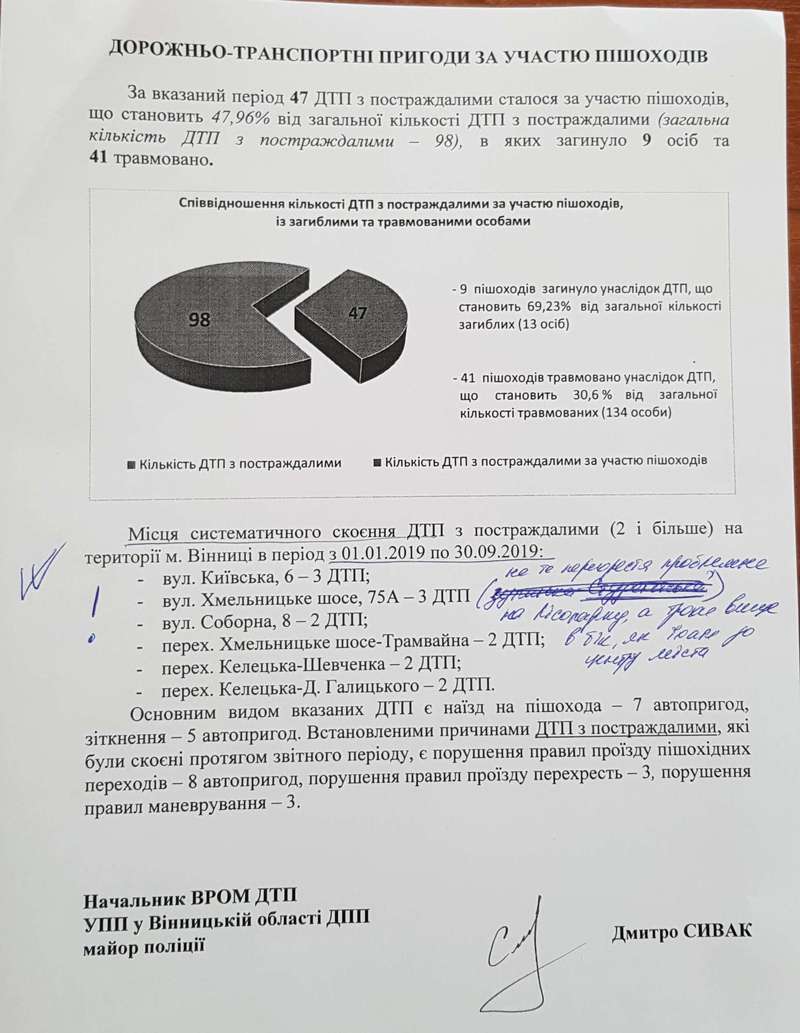 Найцікавіше – «місця систематичного скоєння ДТП з постраждалими на території міста» протягом 9 місяців цього року. Саме цю діаграму надали депутатам. Так от, по три пригоди сталися біля вул. Київська, 6, і Хмельницьке шосе, 75А. По дві зафіксовано у вул. Соборна, 8, перехресть Хмельницьке шосе – Трамвайна, Келецька – Шевченка, Келецька – Д. Галицького.