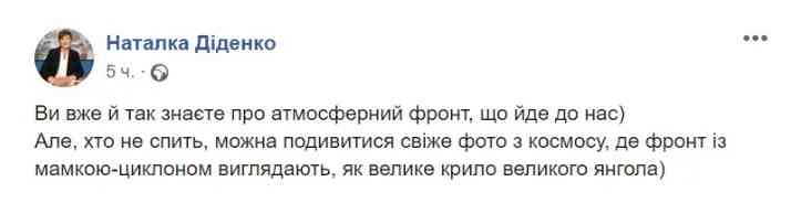 "Ви вже й так знаєте про атмосферний фронт, що йде до нас. Але, хто не спить, можна подивитися свіжі фото з космосу", – написала вона.