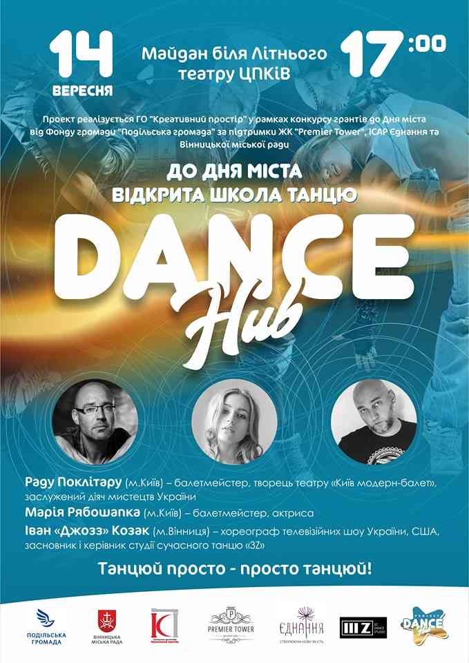 Як повідомили на сайті Вінницької міської ради, 14 вересня о 17:00 на майдані біля Літнього театру у Центральному міському парку відбудеться «DanceHub» – відкрита школа танцю для вінничан та гостей міста. Організатори обіцяють феєричне танцювальне дійство без обмеження у доступі глядачів та з інтерактивними майстер-класами від Раду Поклітару, Марії Рябошапки (м.Київ) та Івана Козака, відомого як Джозз (м.Вінниця).