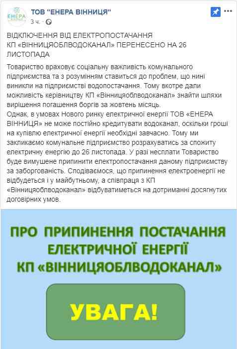 Попри усні домовленості між КП «Вінницяоблводоканал», енергетиками і керівництвом Вінниці та області ТОВ «Енера Вінниця» знову погрожує відключенням електропостачання комунальному підприємству. До 26 листопада комунальники мають розрахуватися із поточною заборгованістю – за жовтень.