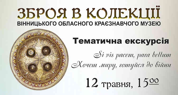 У фондах Вінницького обласного краєзнавчого музею зібрана багата колекція зброї різних часів. Більшість з експонатів знайдено саме на Вінниччині. Тематичну виставку «збройного» напрямку містянам та гостям обласного центру пропонують 12 травня.