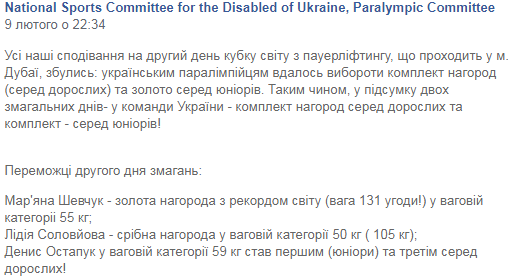 Кубок світу з пара-пауерліфтингу проходить з 8 по 12 лютого у м. Дубай. Участь в спортивних змаганнях беруть 213 спортсменів, що представляють 39 країн світу Національна команда представлена 10 паралімпійцями.