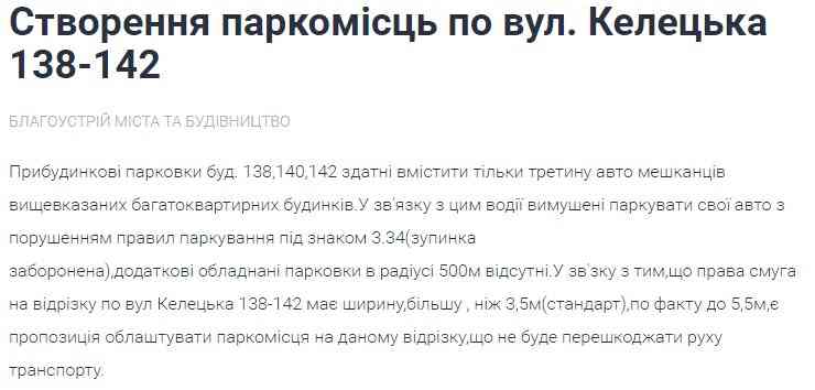 Оскільки права смуга на відрізку по вул Келецька між зазначеними будинками ширша за стандарт, він пропонує облаштувати там паркомісця.