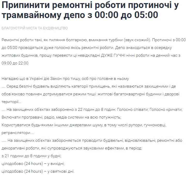 Автор петиції нагадав про закон «про тишу», згідно з яким після 22 години заборонені «гучні» роботи, а саме «ремонтні роботи такі, як пиляння болгаркою, вмикання турбіни (звук схожий)».