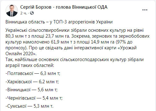 Як написав у Facebook голова Вінницької ОДА Сергій Борзов, область – «у ТОП-3 агрорегіонів України».