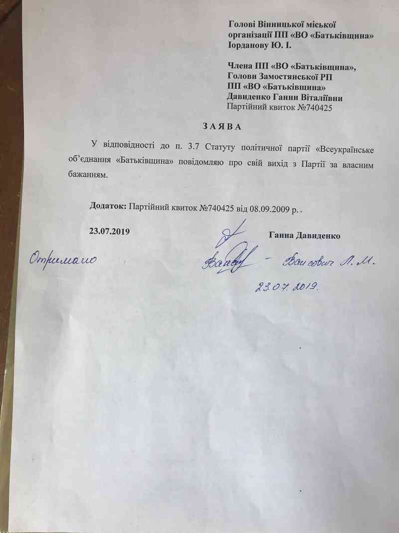«Партія - це команда однодумців зі спільними принципами. Очевидно, що моі особисті принципи розходяться з принципами більшості місцевих партійців. Це видно як мінімум з моїх голосувань на сесії. Місцева «Батьківщина» не є опозицією до місцевої влади. І це - факт. І тому мені доводилося часто відстоювати свою позицію двічі - в партії і в міській раді. Це неправильно. Тому я прийняла для себе рішення вийти з партії. Тим більше, що багато вінничан мене підтримують саме як Ганну Давиденко, а не члена партіі. На виборах до Верховної Ради я спеціально пішла самовисуванкою без партії. І набрала набагато більше голосів, ніж висуванка від партії - Настя Приходько. Тому це рішення є виваженим і остаточним», - прокоментувала причини виходу виданню Ганна Давиденко.